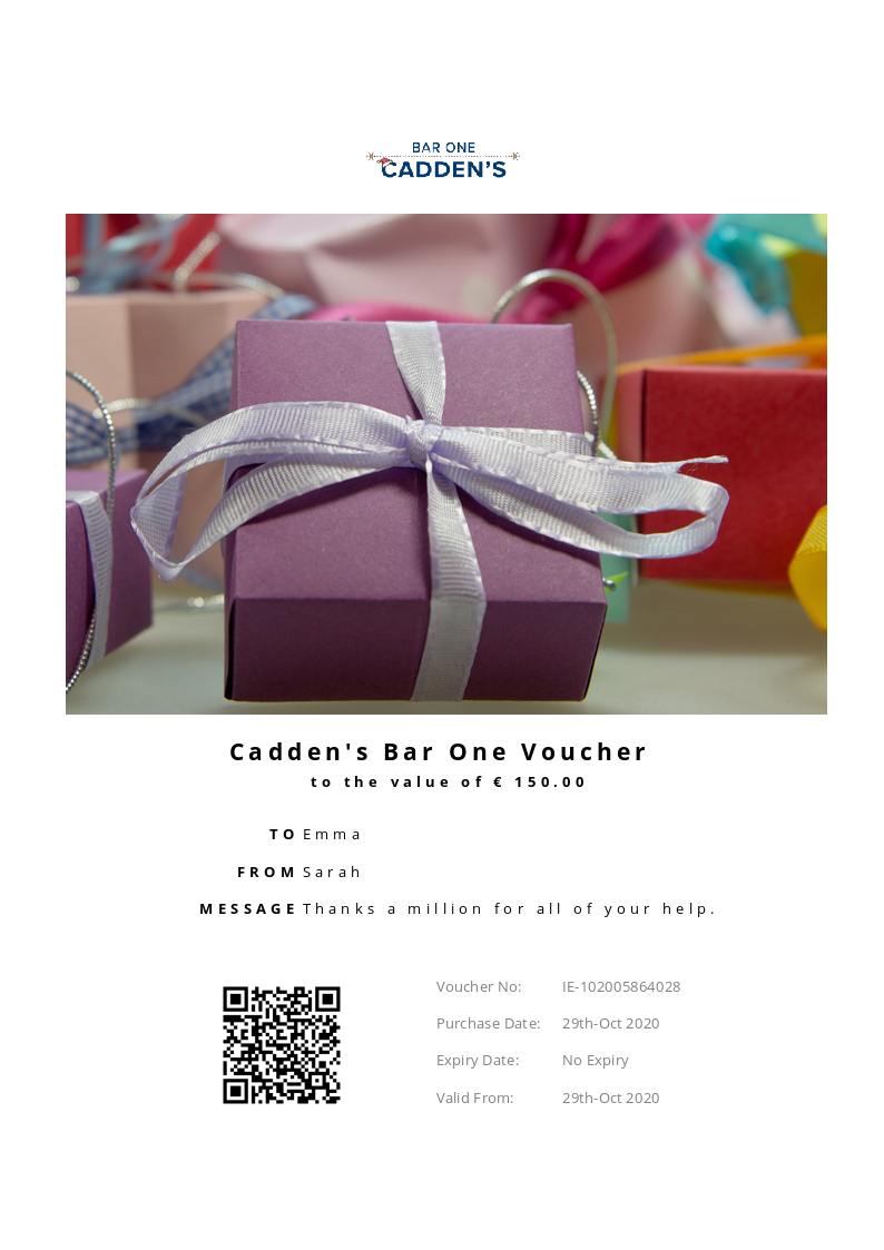 Bar One Public House & Eatery allows you to purchase instantly printable gift vouchers, special offers and tickets using the Voucher Connect platform.